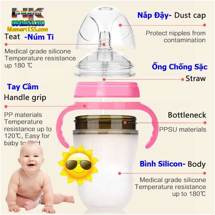 – Núm vú và bình được làm bằng 100% silicone an toàn cho bé.