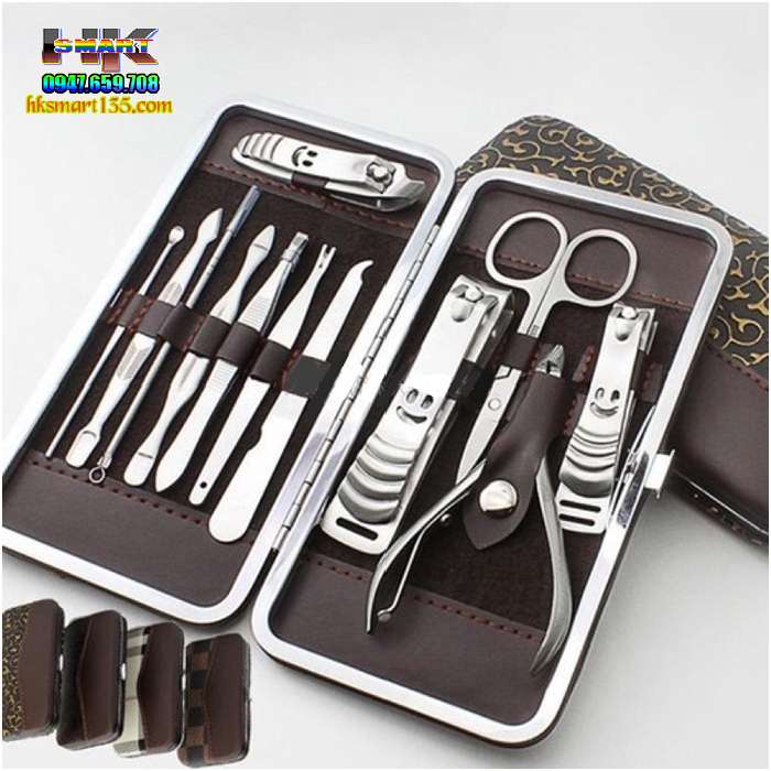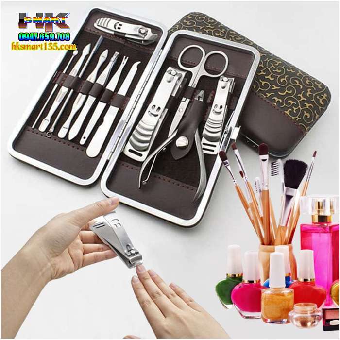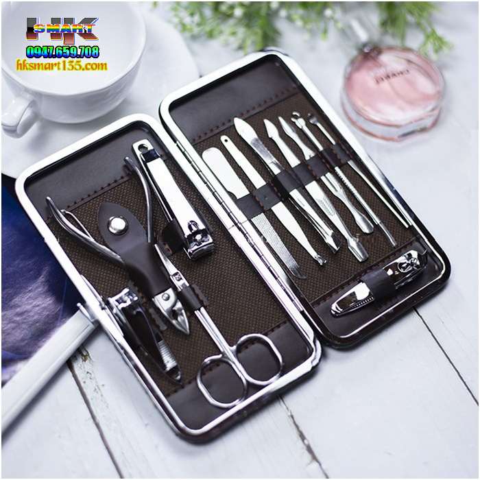 Bộ sản phẩm cắt móng tay bao gồm 12 món (3 đồ bấm móng tay lớn + vừa + nhỏ, kéo cắt lông mũi, kềm cắt da, cây nặn mụn, 1 cây móc tai, 1 dũa, 1 nhíp, 2 cây lấy khóe). Khi cần phải đến tiệm, bạn đã có bộ chăm sóc móng mang theo để tránh các bệnh lây nhiễm khi dùng chung đồ với người khác