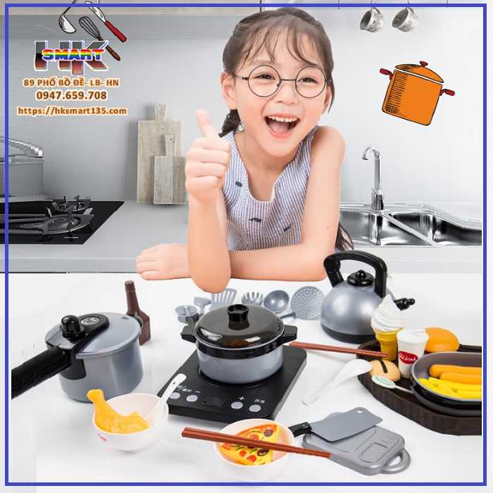 +Bộ đồ chơi nấu ăn gồm 36 món, các đồ vật như nồi áp suất, ấm nước, bếp... được làm y như thật luôn, Bếp từ sử dụng pin, có đèn led hiển thị nhiệt độ, nút bấm tăng giảm như thật. Số hiển thị trên màn led. Nồi áp suất có chốt khóa như nồi thật và vô số các loại thực phẩm giả như Thịt, Cá, Rau cỏ....