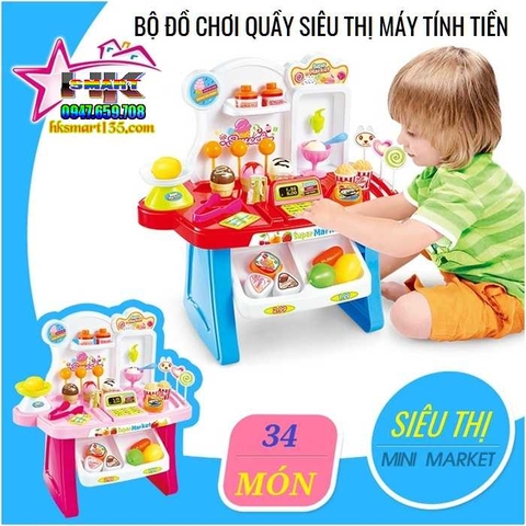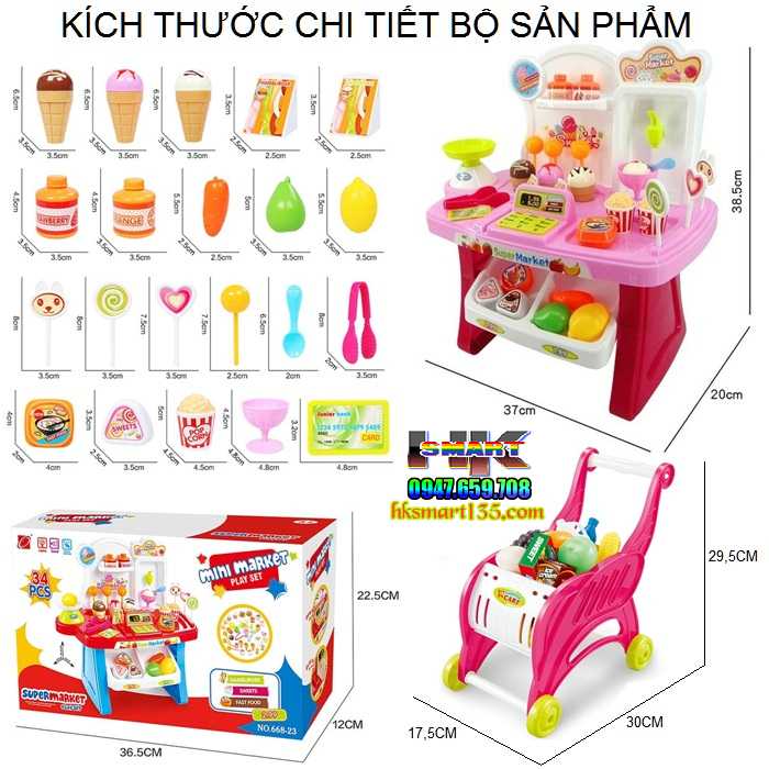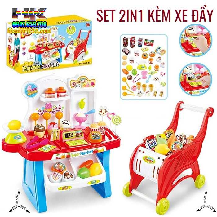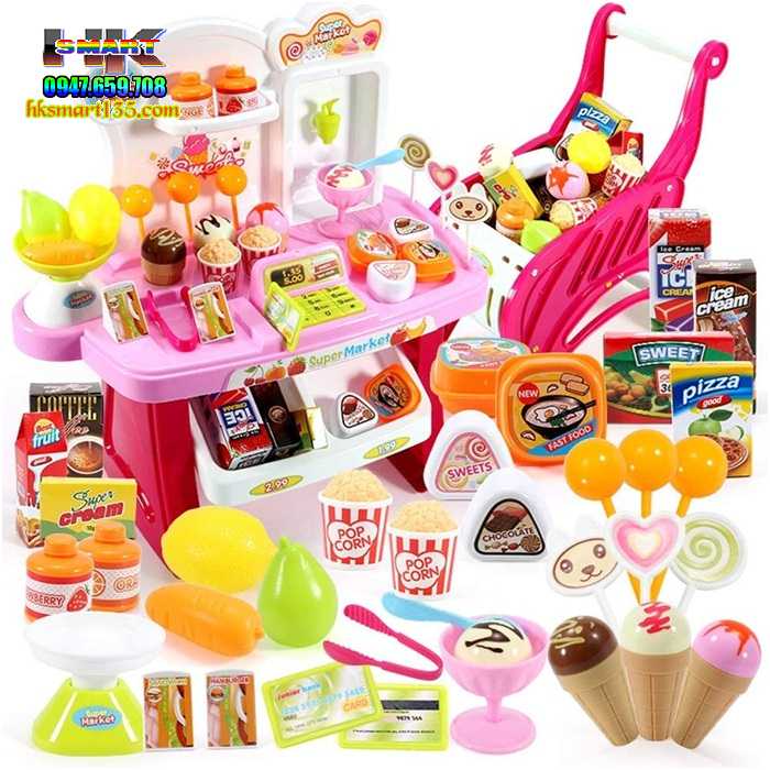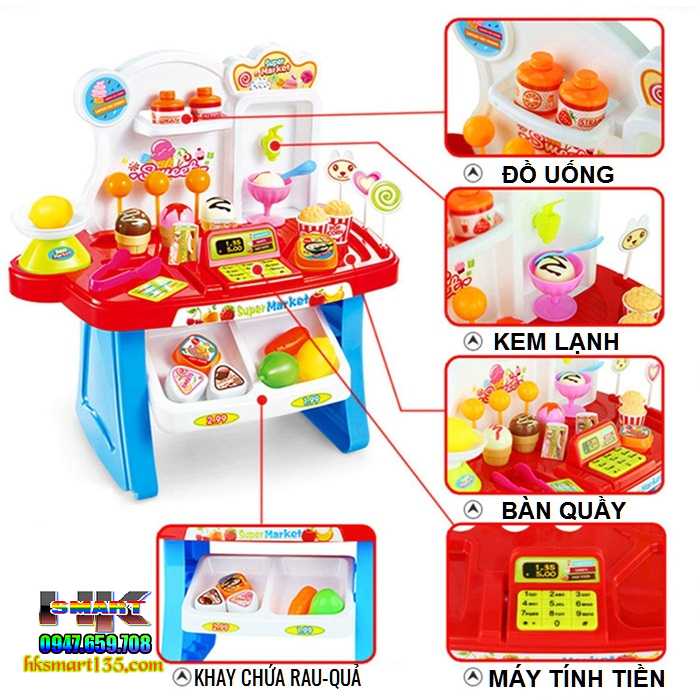 + Quầy hàng siêu thị với nhiều chi tiết như: kẹo mút, kem, kẹp đồ, cân, máy tính tiền kèm xe đẩy