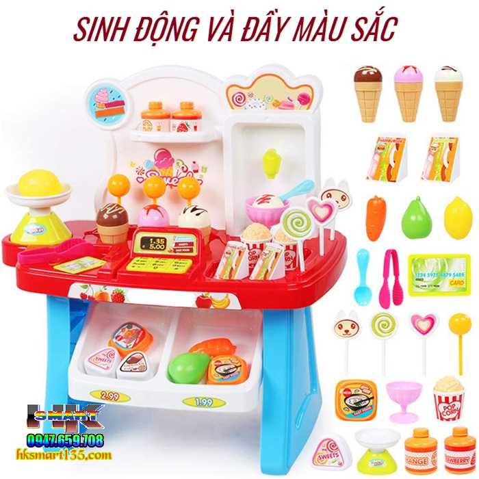 Sản phẩm với 34 món đi kèm gồm Kẹo- Kem- Sữa- Rau Củ Quả...có màu sắc bắt mắt, tươi sáng sẽ thu hút, kích thích trí tưởng tượng tiềm ẩn trong bé. Giúp kích thích sự sáng tạo, tư duy cũng như cho bé trải nghiệm, đóng vai cũng như hiểu hơn về các nghề trong xã hội. Qua việc tính toán tiền hàng, bé sẽ làm quen với môn toán học và các con số