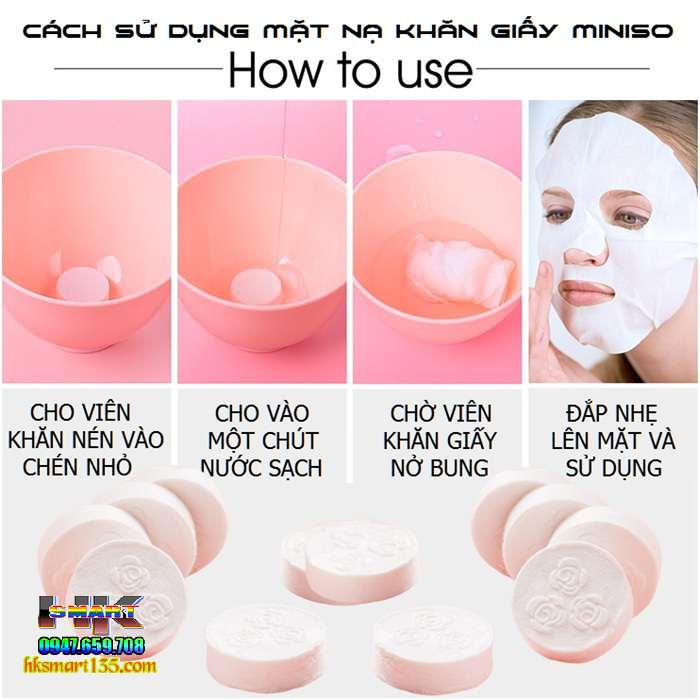 – Cho Mặt nạ giấy nén Miniso vào nước hoặc lotion, toner,nước ép hoa quả, sữa tươi… trong giây lát viên mặt nạ nở ra là dùng được ngay.