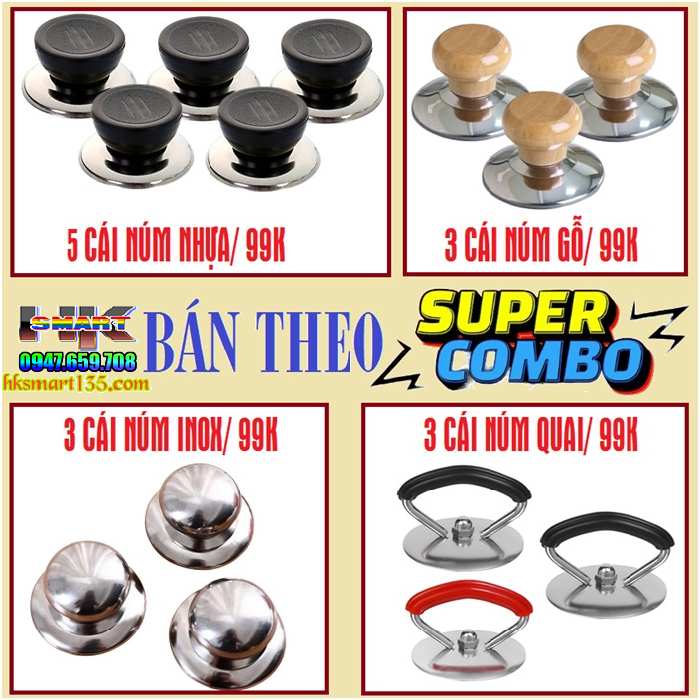 Hk Smart Shop cung cấp cho bạn 3 mẫu với 3 kiểu dáng xinh xắn để bạn lựa chọn, NÚM NHỰA- NÚM GỖ và NÚM KIM LOẠI, phù hợp sử dụng cho mọi loại vung nồi thông dụng trên thị trường hiện nay. Với các mẫu núm thay thế này, chỉ cần bỏ ra chi phí cực thấp là bạn sẽ không còn phải bực mình mỗi khi nấu với chiếc vung hỏng núm cầm nữa. Hãy Call hoặc Zalo ngay cho chúng tôi để sở hữu nhé.
